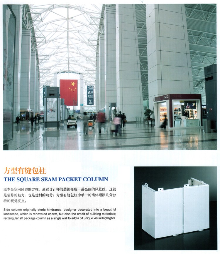 方形有縫包柱鋁單板,原本是空間妨礙的方柱,經(jīng)過設(shè)計師的裝修讓它變成了一道美麗的風景線,這就是方形包柱鋁單板的魅力,它能廣泛的應(yīng)用在加油站、體育館、地鐵高鐵站等,增加視覺亮點。
